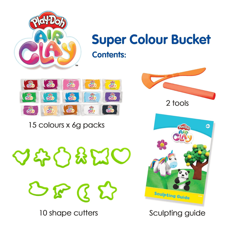 ¡Dale vida a tu creatividad con Play-Doh Air Clay! Esta arcilla suave como la seda es fácil de moldear y se seca al aire sin necesidad de hornear. Con 10 moldes, 2 herramientas y una guía de escultura llena de ideas, podrás crear llaveros, accesorios, figuras y mucho más.