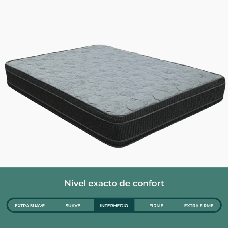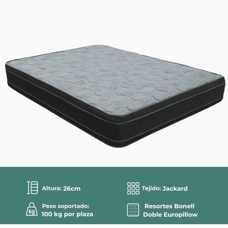 Gracias a su sistema de resortes Bonell con doble marco perimetral de acero templado, este colchón mantiene la forma, brinda firmeza media y distribuye el peso de manera uniforme.
