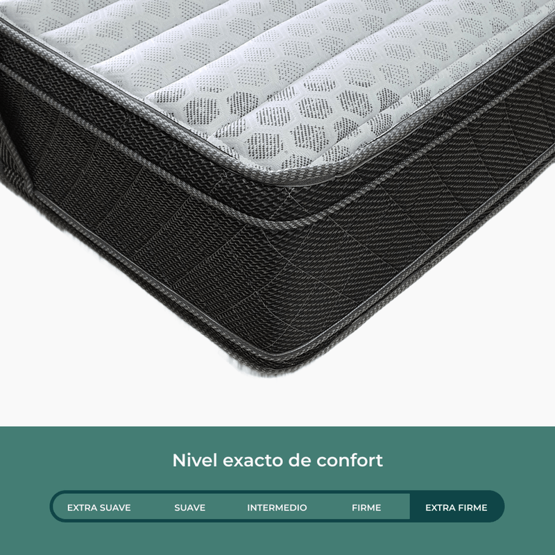 La capa superior con Doble Euro Pillow aporta un toque mullido y agradable al contacto inicial, logrando el balance perfecto entre suavidad y firmeza. El tejido de punto premium matelassé suma elegancia, transpirabilidad y resistencia, mientras que el tratamiento antiácaros cuida tu salud y prolonga la vida útil del producto.