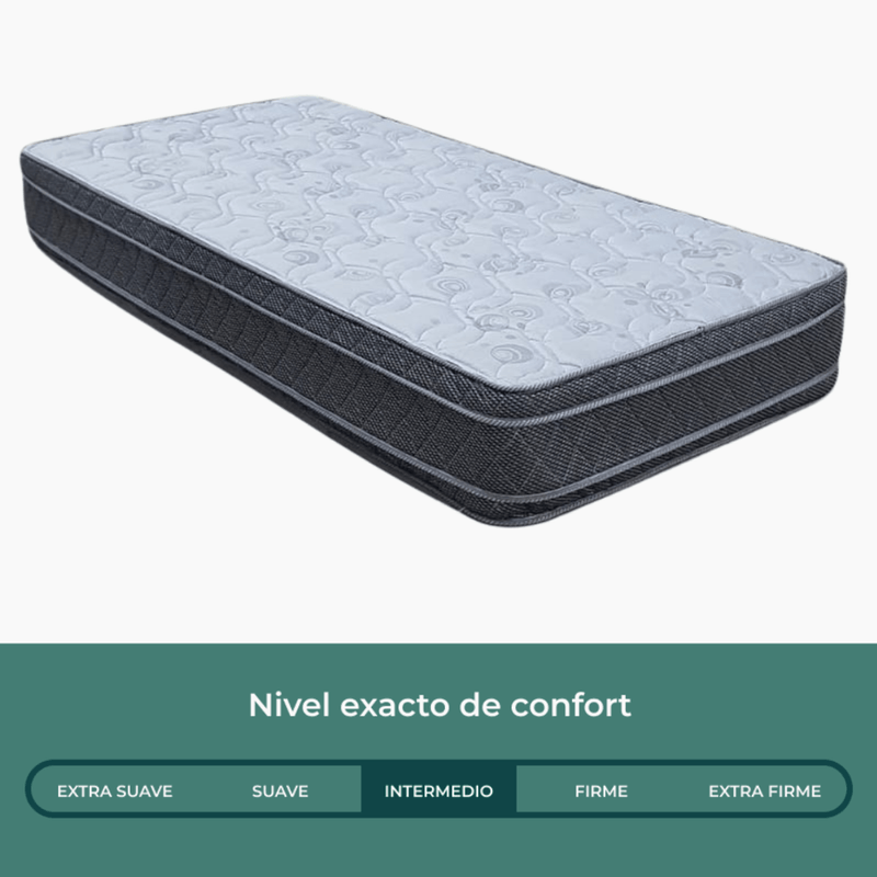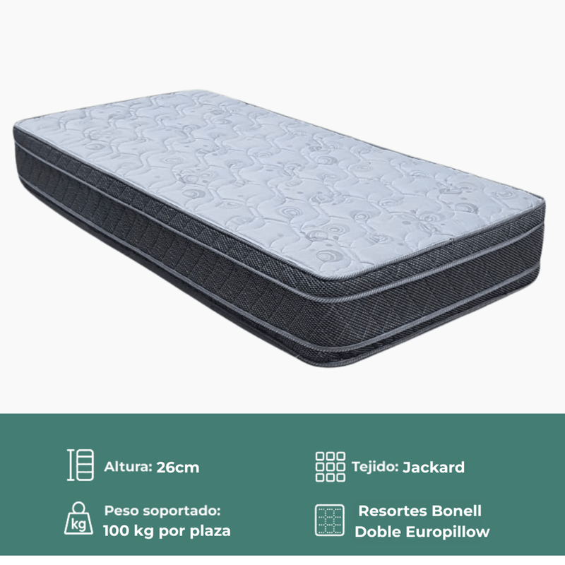 Gracias a su sistema de resortes Bonell con doble marco perimetral de acero templado, este colchón mantiene la forma, brinda firmeza media y distribuye el peso de manera uniforme.