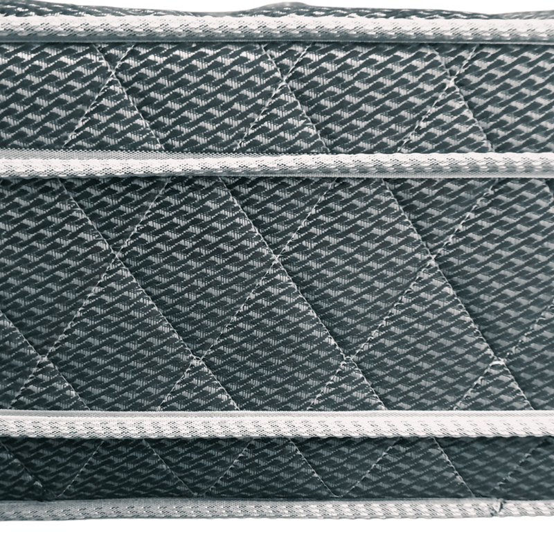 El sommier acompaña con una base de madera reforzada, tapizada en jackard de calidad premium y patas de madera resistentes, formando una estructura compacta y estable que completa la experiencia de descanso.