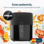 La Fantastik 6500 de Cecotec te permite preparar tus comidas favoritas con una sola cucharada de aceite, gracias a su potente motor de 1700W y a la innovadora tecnología de aire caliente PerfectCook, que garantiza una cocción uniforme y resultados crujientes por fuera, tiernos por dentro.