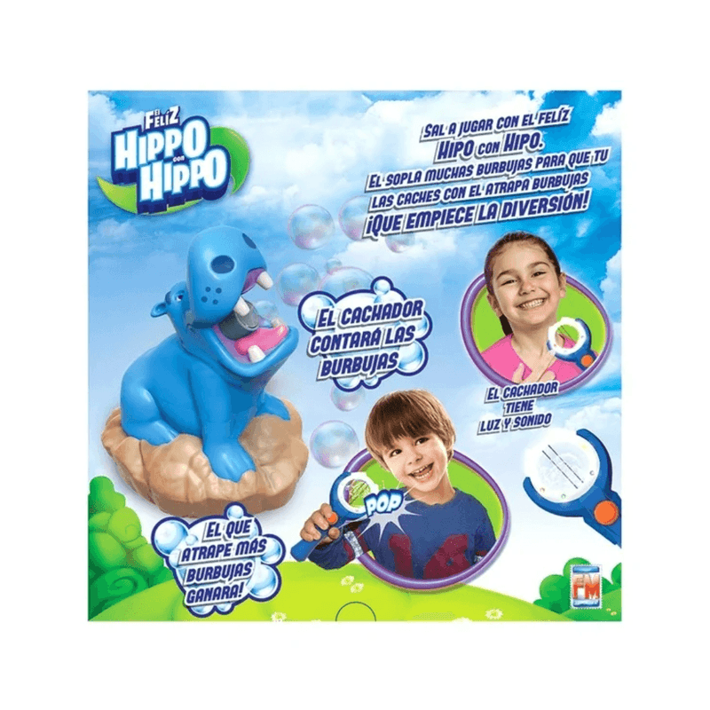 ¡Salí a jugar con el simpático Hippo con Hipo, el hipopótamo que no para de hacer burbujas! Él sopla montones de burbujas mientras vos y tus amigos intentan atraparlas con el cazador especial.