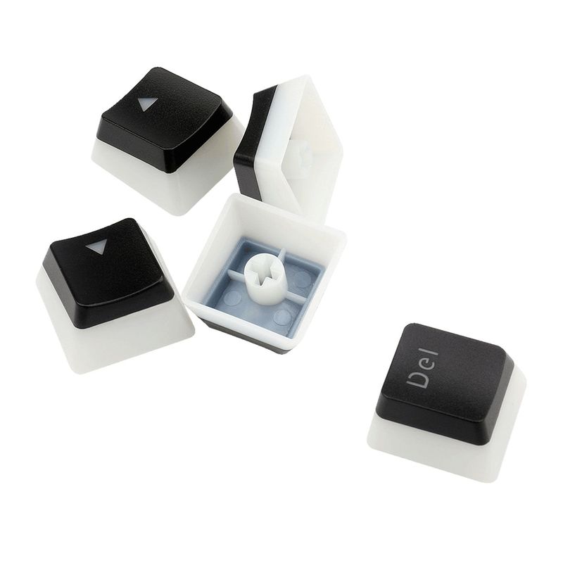 Inyección doble disparo en PBT: la tecnología de inyección doble disparo ofrece un grabado que nunca se borra y el material esmerilado texturizado utilizado en la capa exterior no deja manchas de aceite ni de sudor.