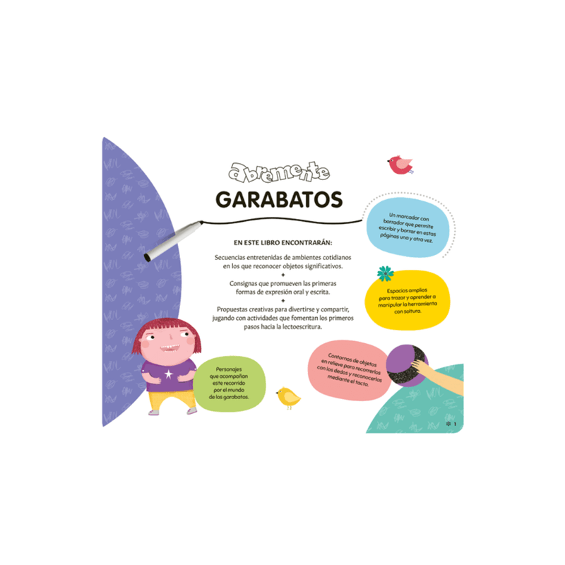 Garabatos: Fomenta la expresión libre y el desarrollo de trazos básicos que preparan para la escritura.