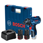 La llave de impacto Bosch GDR 120-LI, es una herramienta inalámbrica de 12V, súper liviana y compacta, es la única del mercado con 2 velocidades, líder absoluta del segmento en autonomía de la batería, además viene con luz LED para trabajar en áreas con poca iluminación. La llave de impacto inalámbrica Bosch GDR 120-LI tiene un torque de 180NM, una alta tasa de impacto por minuto de 36000 IPM y una alta rotación de 2800 RPM y pesa solo 1,1 kg, es decir que además de ser una herramienta liviana para trabajar tiene una gran potencia y rendimiento. Ideal para perforar y atornillar a la perfección en un mismo encastre ya que cuenta con un mandril 2 en 1; hexagonal de 1/4"" y cuadrado de 1/2"". Herramienta 100% compatible con baterías y cargadores Bosch 12V. Esta versión incluye 2 baterías, 1 cargador y maleta. Tiene 1 año de garantía Bosch.