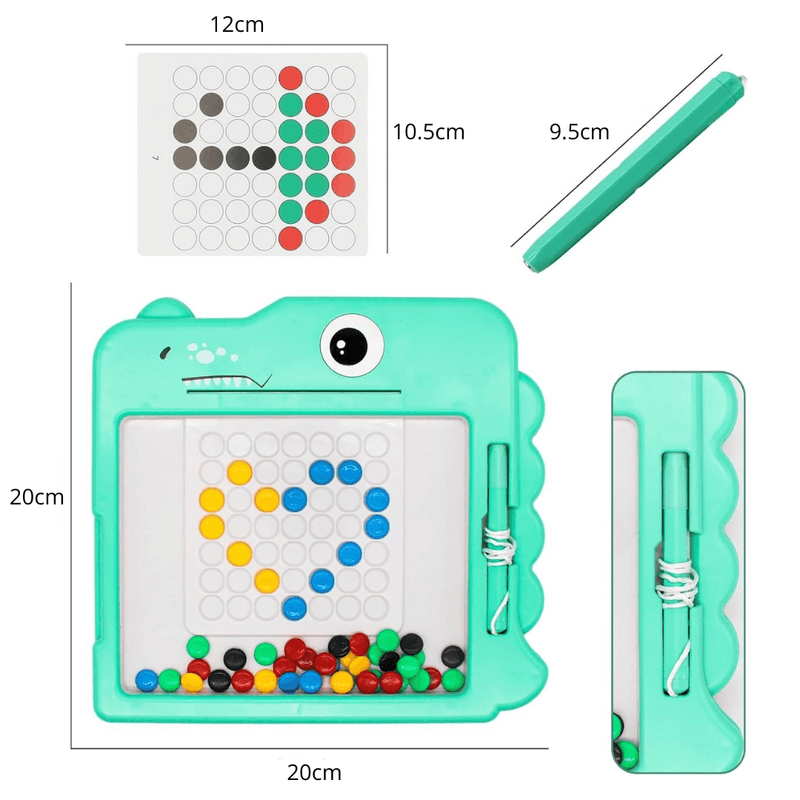 - Incluye bolitas magnéticas de colores para formar dibujos.