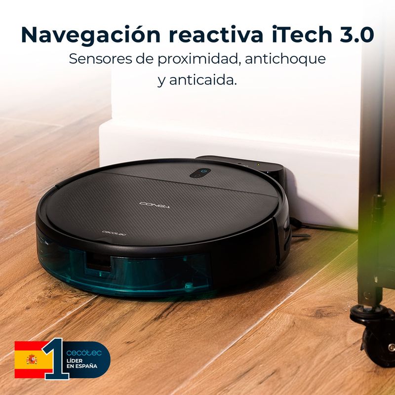 Robot aspirador con navegación giroscópica para una limpieza total de la casa. Motor de succión de 2000 Pa. 2 cepillos laterales.Mopa de fregado. Autonomía de 120 minutos. Control con APP de CECOTEC y con mando a distancia. Conectividad WiFi 2,4 GhZ y Bluetooth.